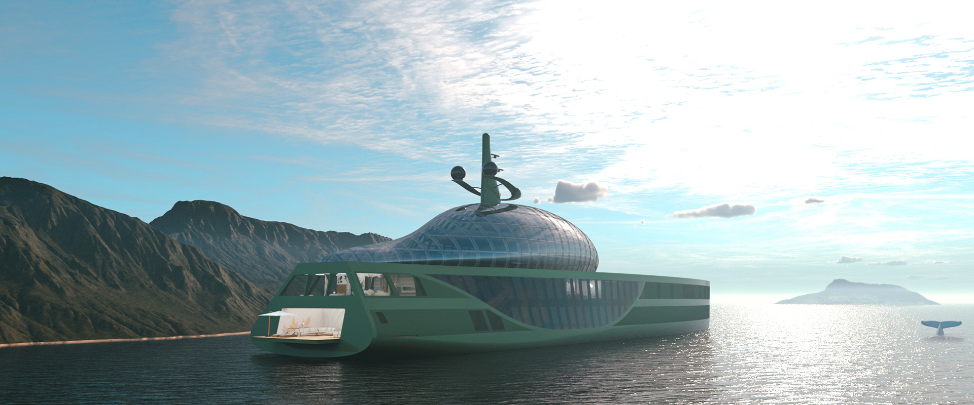 The superstructure, with its flowing lines and curves, mirrors the delicate form of a water drop. It is design to be fully reinforced electrochromic and photovoltaic glass: not only is one of the best materials to perfectly resemble water but can also be used to absorb solar energy and put it into the vessel, and it can be electrically dimmed. This system, used in transportation design to dim windows, allow us to design single glass panels that can be dimmed separately or together by the guests or from the bridge. This system will be used in every piece of glass of the vessel.
