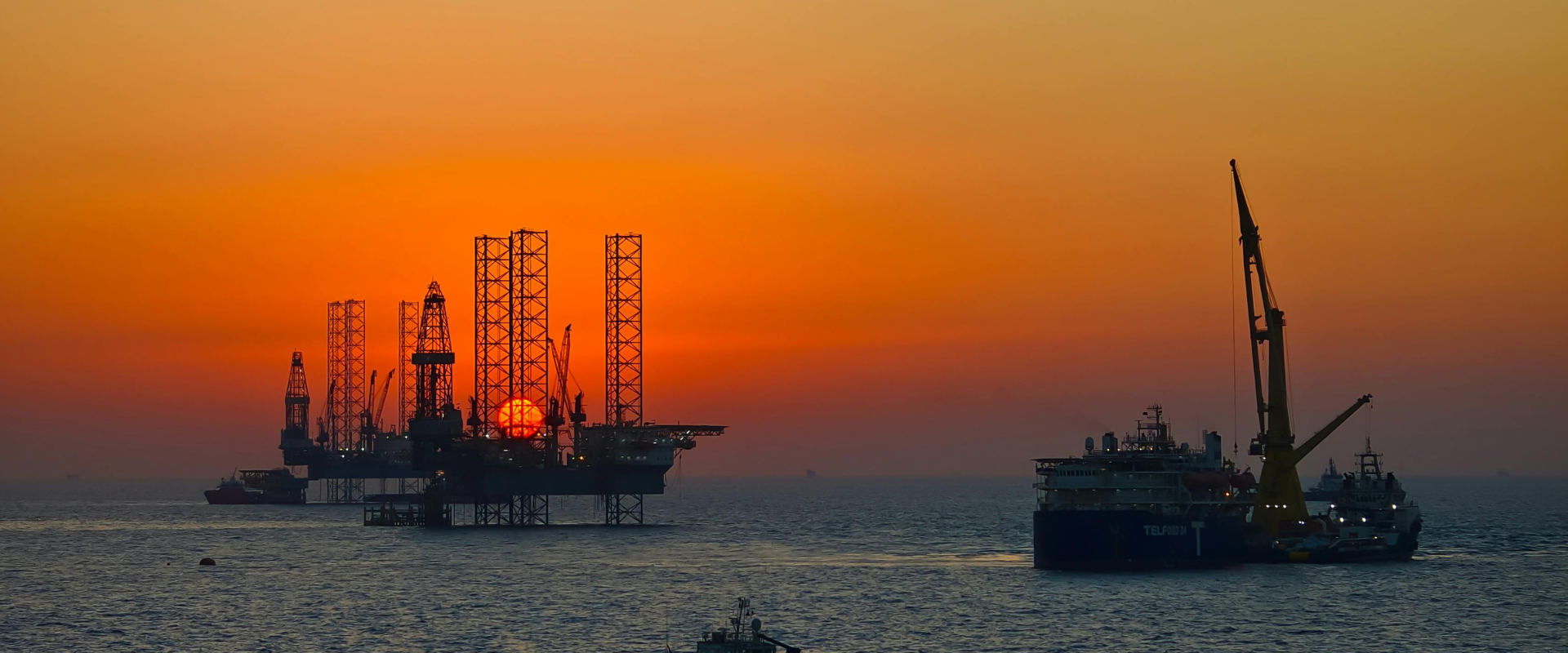 Image shows an oil rig and vessel at sunset with a colourful sky. BLÜCHER Strengthens Support for Greek and Cypriot Marine Markets Through Partnership with OCEANDYNAMIC, MTB Events.